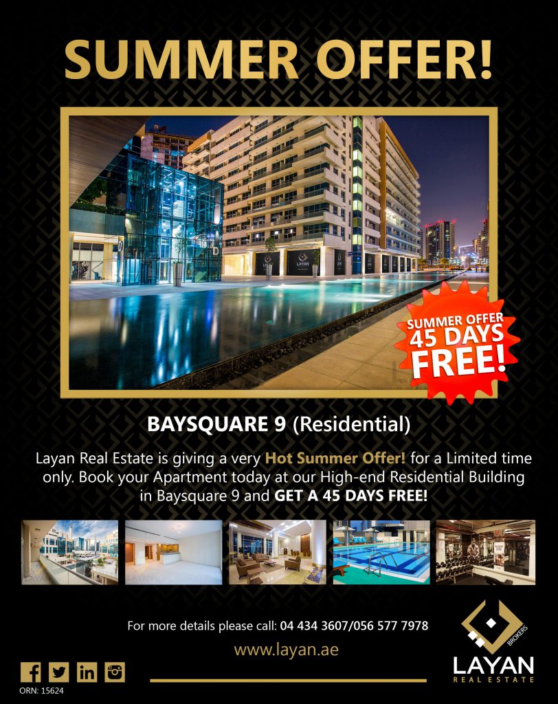 Layan Real Estate is giving a very Hot Summer Offer! for a Limited time only. Book your Apartment today at our High-end Residential Building in Baysquare 9 and GET A 45 DAYS FREE!